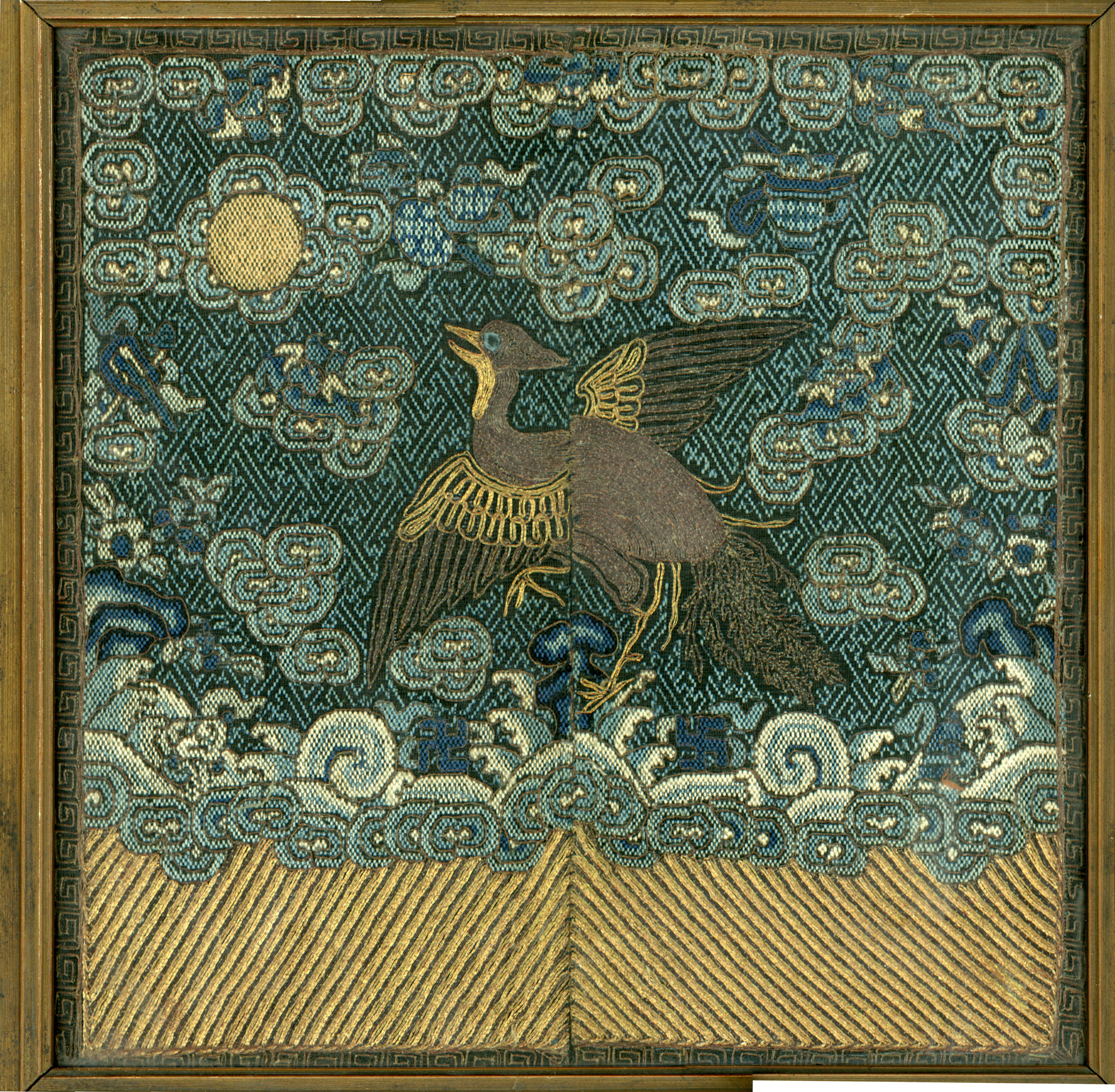 Shòu is the character for long life which often appeared in the border design around the square. When combined with the bat motif or swastika pattern it stood for long life and happiness. The sun is a symbol of heaven and the emperor, and intellectual enlightenment. The swastika pattern (wan) is one of the oldest designs in the world, and is said to have been associated with prehistoric shaman rituals. It became a Buddhist lucky symbol around AD 200 and represents the seal of Buddha's heart. It is often incorporated into a design with shòu to mean "ten thousand years of long life."