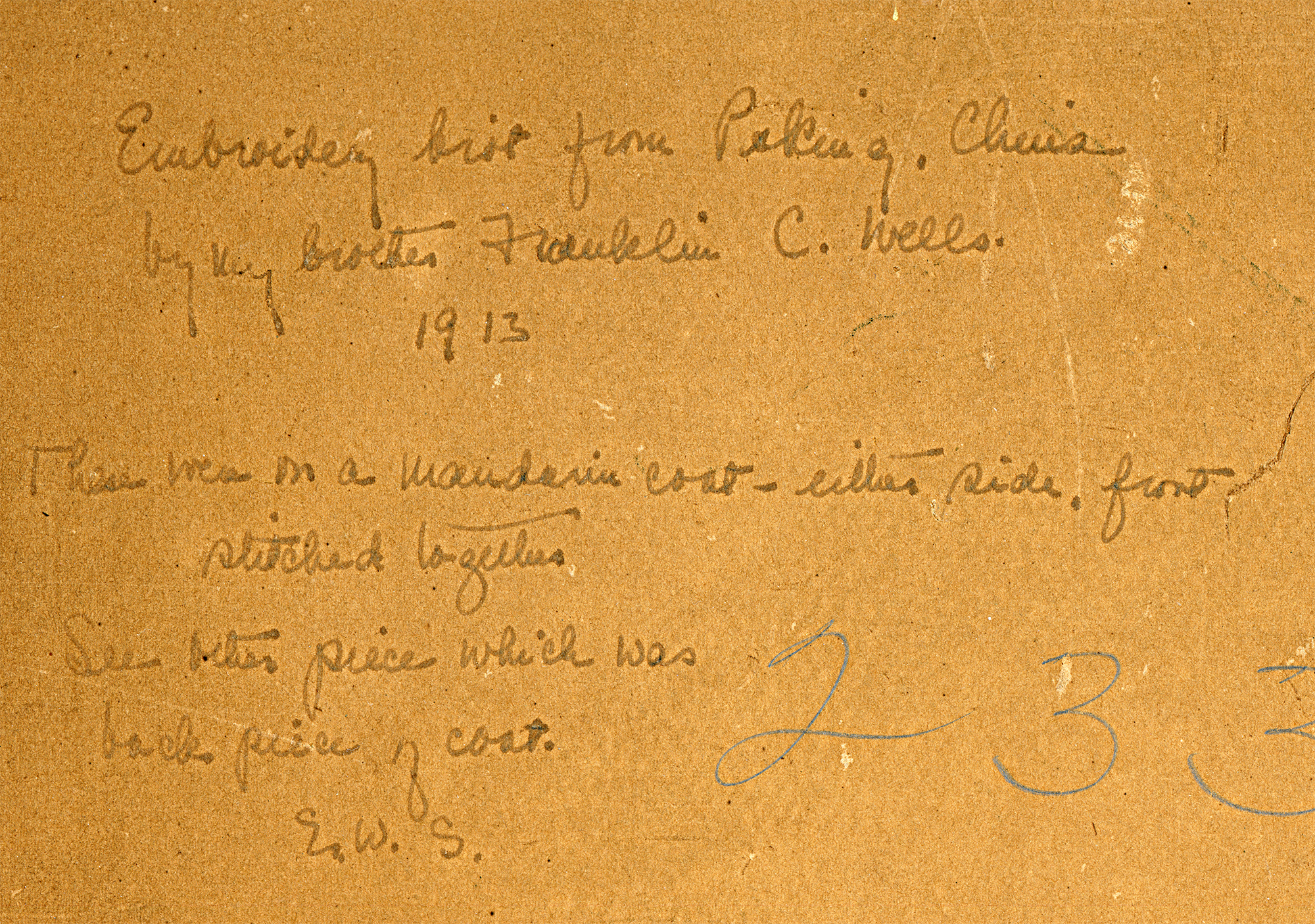 In February 2022, I got an email from a woman named Debbie who bought a framed rank badge at an estate sale in Sparta, North Carolina. On the back, she deciphered a faint caption that said it was brought "from Peking, China, 1913, by my brother Franklin C. Wells, Jr." (above, right)! She Googled around for more information on "Franklin C. Wells" and found this Webpage!