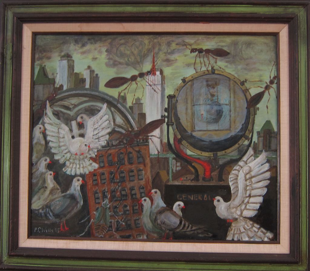 F. C. Wells, Jr., loved to paint. This one from 1943 is my favorite. It's a very allegorical work that represents the view outside his Manhattan office. Look closely at the reflection in the searchlight and you'll see an inverted window, with a figure looking out it. More paintings are available online.