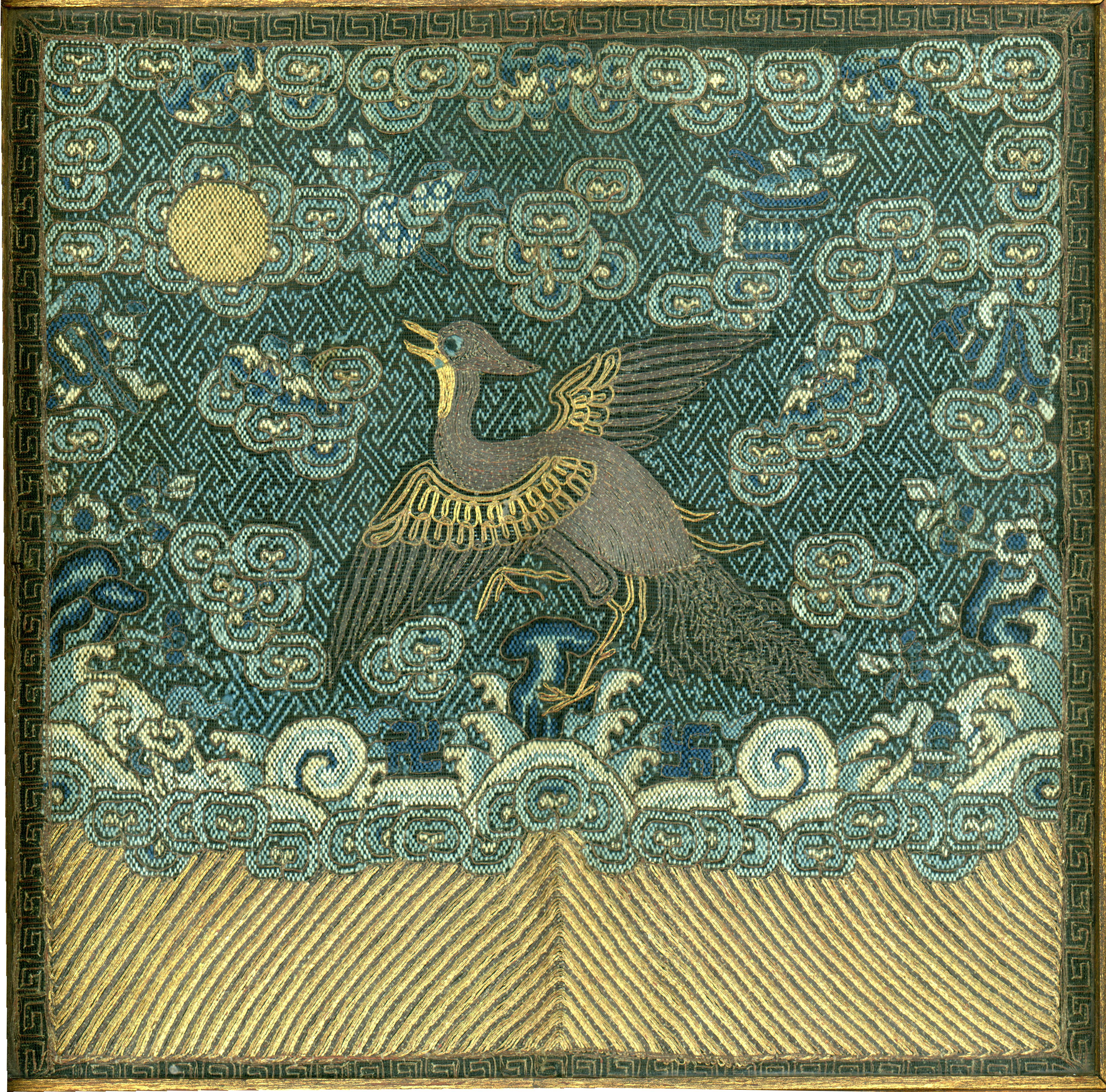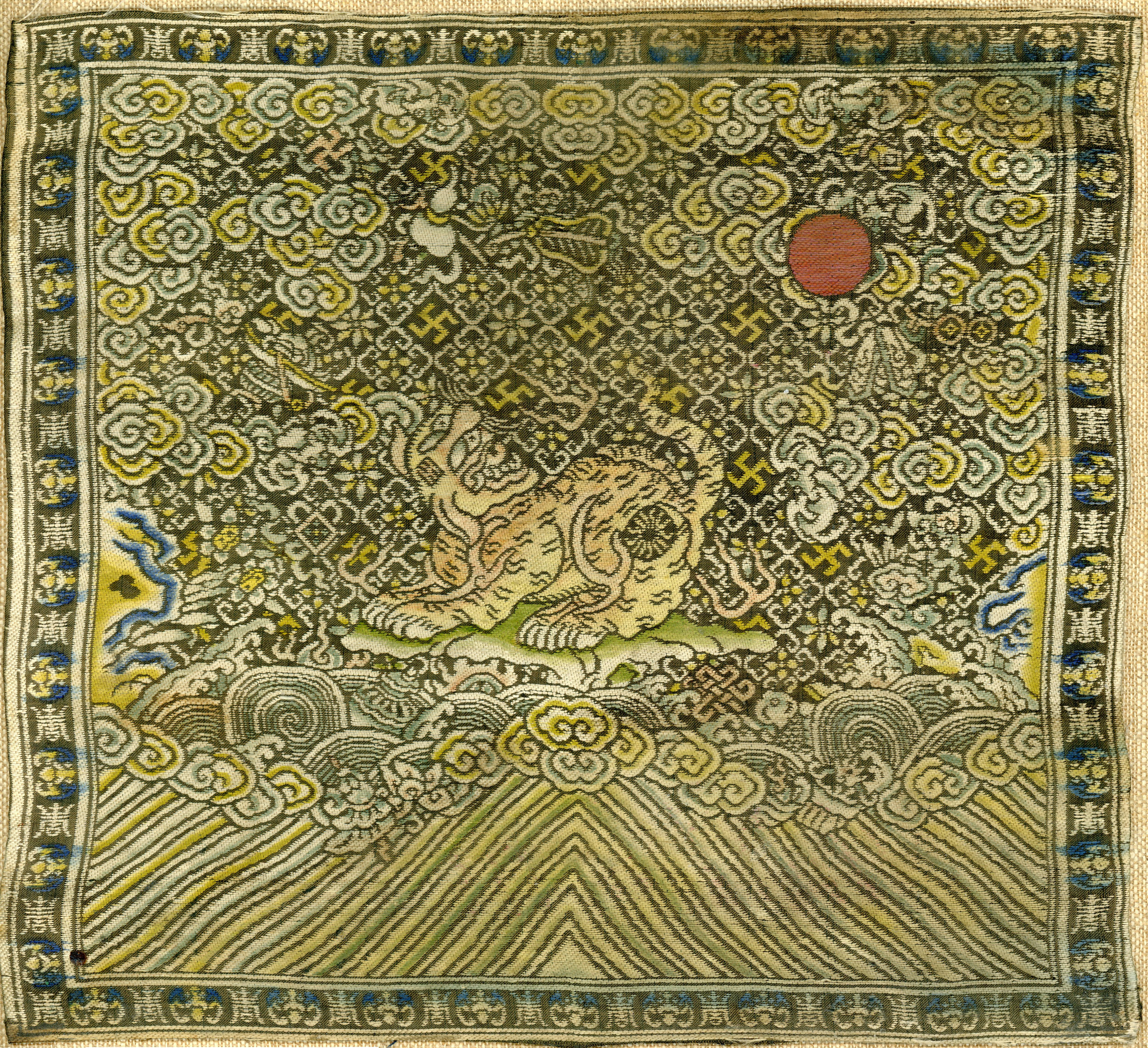 Shòu is the character for long life which often appeared in the border design around the square. When combined with the bat motif or swastika pattern it stood for long life and happiness. The sun is a symbol of heaven and the emperor, and intellectual enlightenment. The swastika pattern (wan) is one of the oldest designs in the world, and is said to have been associated with prehistoric shaman rituals. It became a Buddhist lucky symbol around AD 200 and represents the seal of Buddha's heart. It is often incorporated into a design with shòu to mean "ten thousand years of long life."