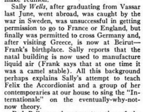 "Sally Wells, after graduating from Vassar last June [1939], went abroad, was caught by the war in Sweden, was unsuccessful in getting permission to go to France or England, but finally was permitted to cross Germany [!] and, after visiting Greece, is now at Beirut—[her father, my grandfather] Frank's birthplace. Sally reports that the natal building is now used to manufacture liquid air (Frank says that at one time it was a camel stable).
